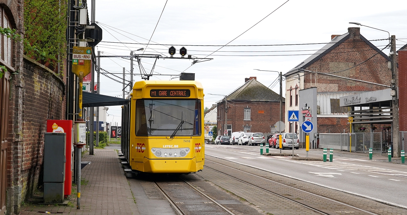 Von der Station Ouest aus fuhr ich nun mit der Linie M2 noch einmal über Piges und Providence weiter hinaus entlang der Strecke, die bis zur Station Pétria stadtbahnmäßig ausgebaut ist, dabei mehrmals die Sambre und die Autobahn quert und auch einige Tunnelabschnitte aufweist. Kurz vor Anderlues wandelt sich das Bild komplett, und es geht als Überlandtram eingleisig entlang der Nationalstraße N90 weiter. Am Ortseingang schwenkt die Strecke nach links und macht einen Bogen über das Depot Anderlues durch den Ort. Die direkte Strecke entlang der Rue de Charleroi ist stillgelegt.