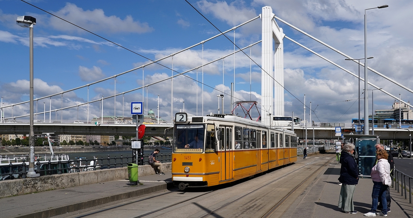Wagen 1451 (CSMG2, Ganz 1975) an der Haltestelle Március 15. tér, im Hintergrund die Elisabethbrücke (Erzsébet híd), 29. Mai 2025